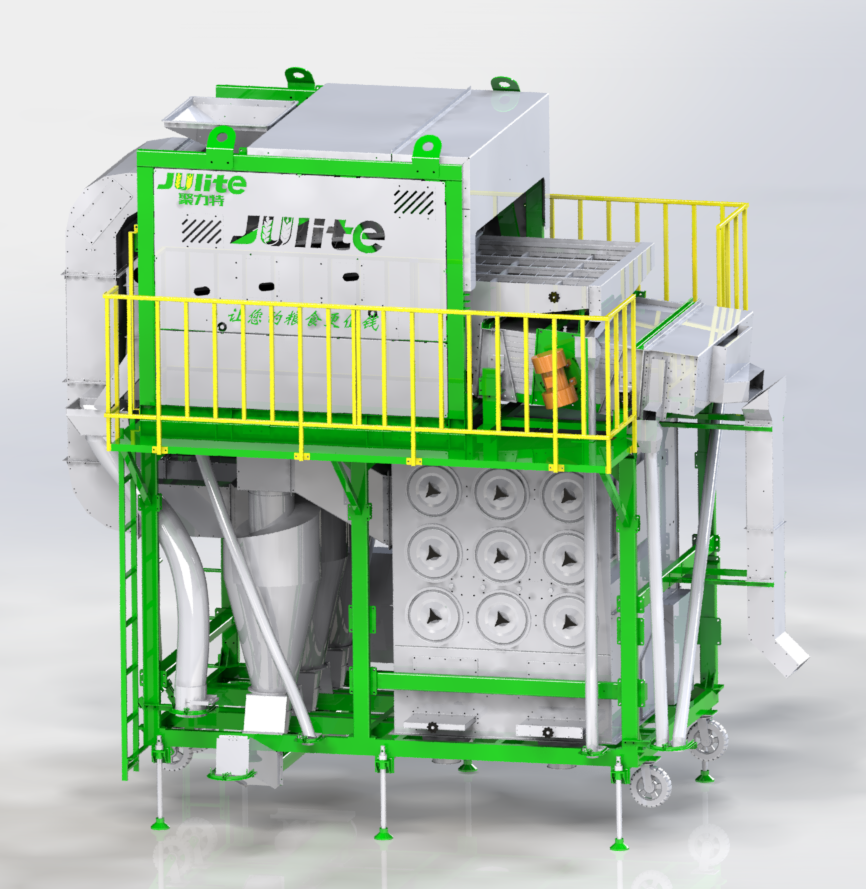 5XCSH-50環(huán)保初清篩主要由上下兩部分結(jié)構(gòu)組成,其中上部分功能為臥式比重風(fēng)選、分級(jí),下部分功能為二級(jí)除塵;物料首先經(jīng)喂入斗進(jìn)入臥式風(fēng)選比重臺(tái),通過(guò)臥式比重風(fēng)選分離去除物料中的粉塵、糠殼、碎秸稈、玉米軸芯等輕雜,其中含塵氣體經(jīng)旋風(fēng)除塵器完成一級(jí)除塵,去除粉塵、糠殼等輕雜,經(jīng)過(guò)一級(jí)除塵的細(xì)小粉塵空氣進(jìn)入脈沖除塵器完成二級(jí)除塵,去除更細(xì)小的粉塵,達(dá)到合規(guī)潔凈排放。臥式比重風(fēng)選分離后的物料進(jìn)入一層大雜篩去除大雜,然后并行進(jìn)入四層小雜篩去除小雜,排出成品。
